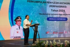 Liputan banten.com, Serang –Penjabat (Pj) Gubernur Banten Al Muktabar berharap dengan dilaksanakannya Rapat Kerja Nasional (Rakernas) Perkumpulan Penyuluh Antikorupsi Nasional (Perpaksinas) di Provinsi Banten dapat menjadi penguatan kelembagaan dan merumuskan langkah kerja yang memberikan kontribusi dalam percepatan pembangunan, baik di daerah maupun di tingkat nasional.